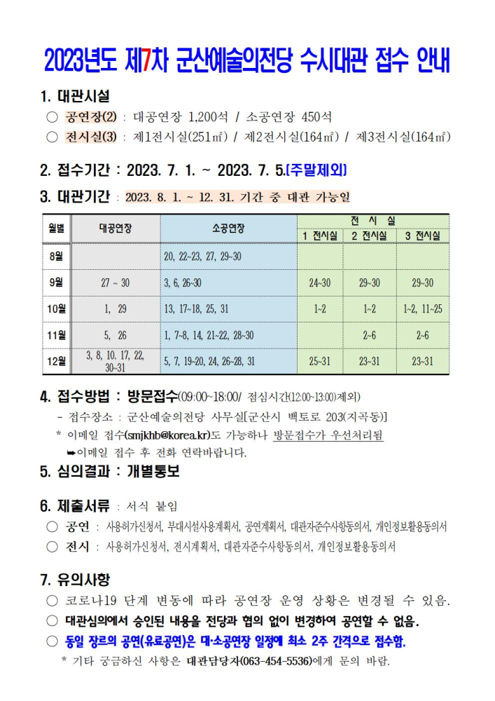 46 2023년도 군산예술의전당 수시대관(8차) 접수 안내 다운받기 예술의전당관리과 23.07.25 863