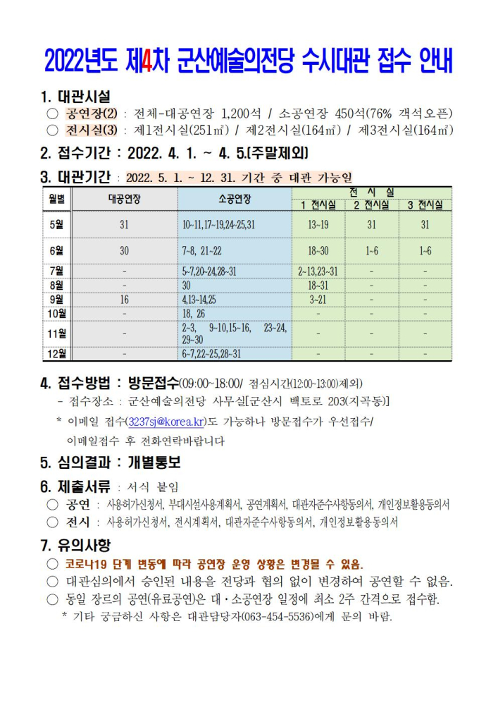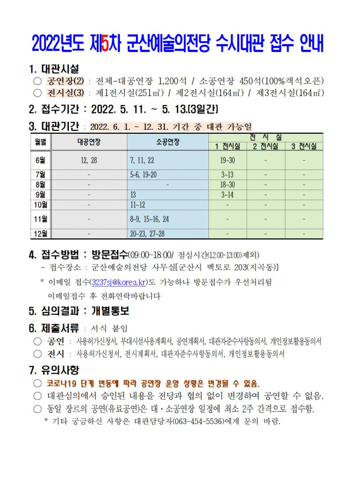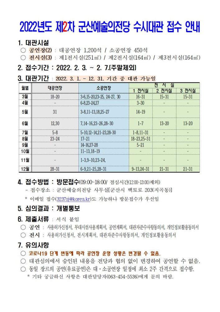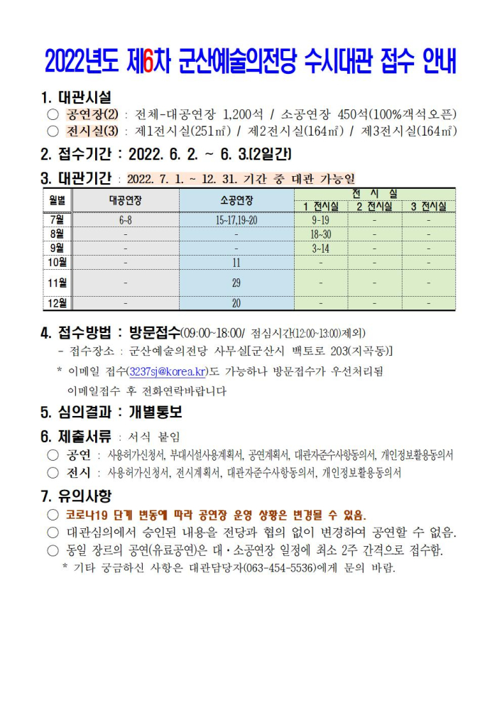 32 2022년도 군산예술의전당 수시대관(제7차) 접수 안내 - 8월 잔여일, 10월 다운받기 예술의전당관리과 22.06.29 1186