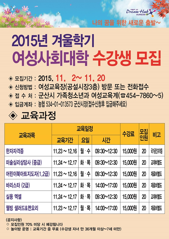 154 [모집] 2015년 겨울학기 여성사회대학 수강생 모집 다운받기 예술의 전당 15.10.30 1577
