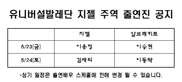 | 20 | [기획공연]유니버설 발레단 지젤 주역 출연진 공지 |