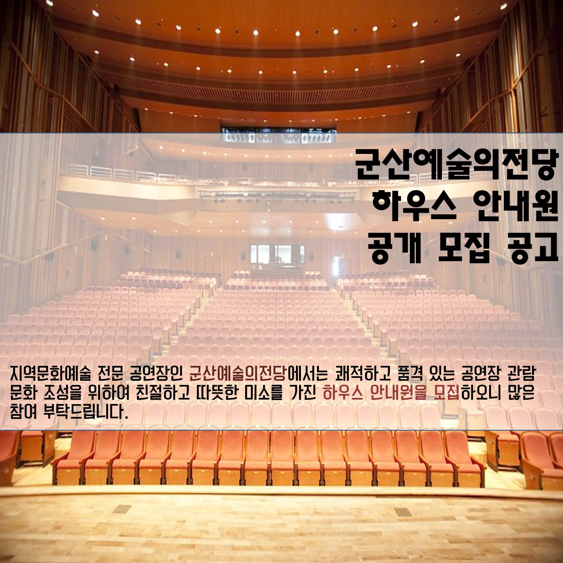 지역문화예술 전문 공연장인 군산예술의전당에서는 쾌적하고 품격 있는 공연장 관람 문화 조성을 위하여 친절하고 따뜻한 미소를 가진 하우스 안내원을 모집하오니 많은 참여 부탁드립니다.