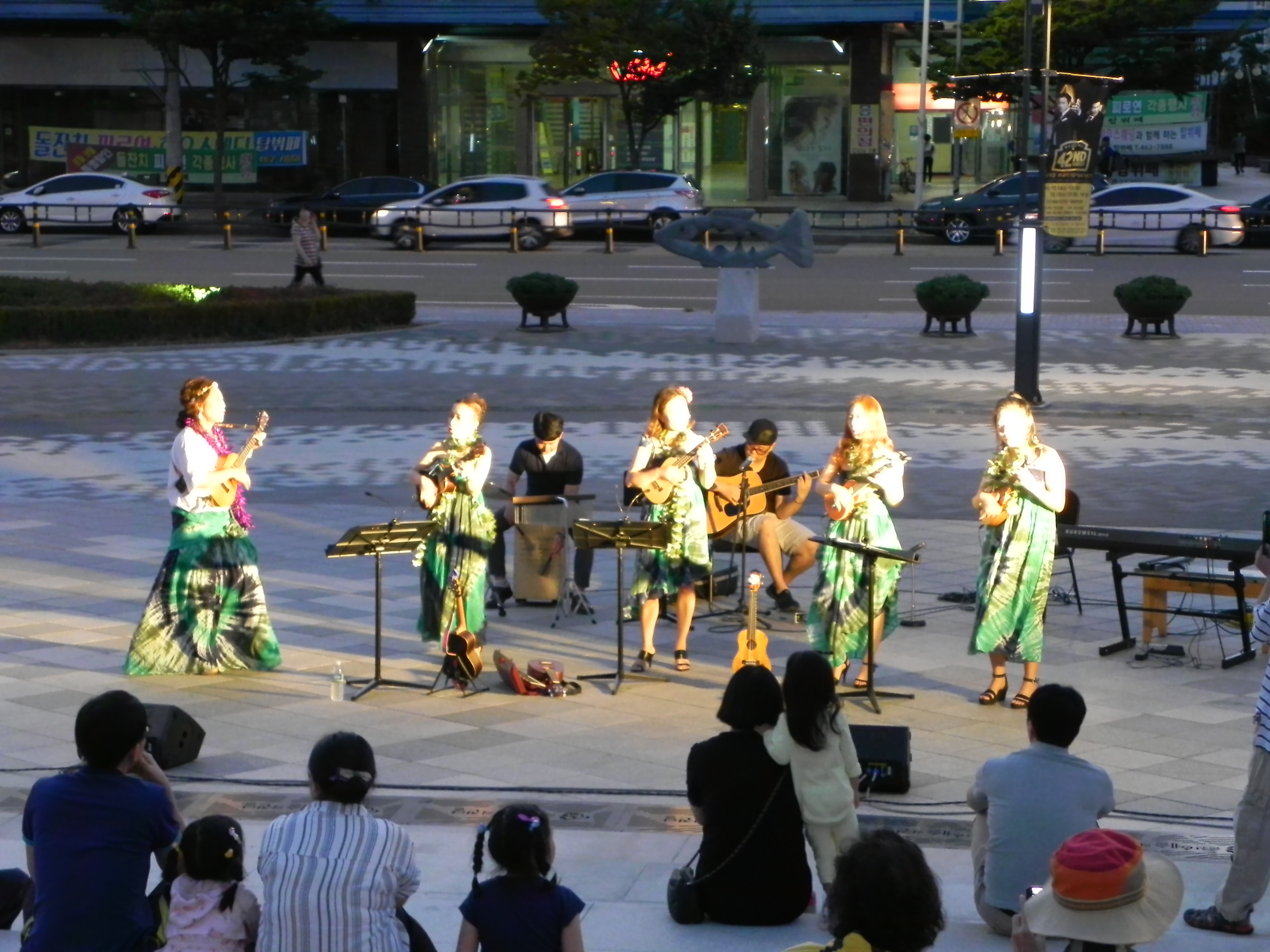 예술의전당 광장에서 이루어진 우쿨렐레의 버스킹 공연 사진입니다.