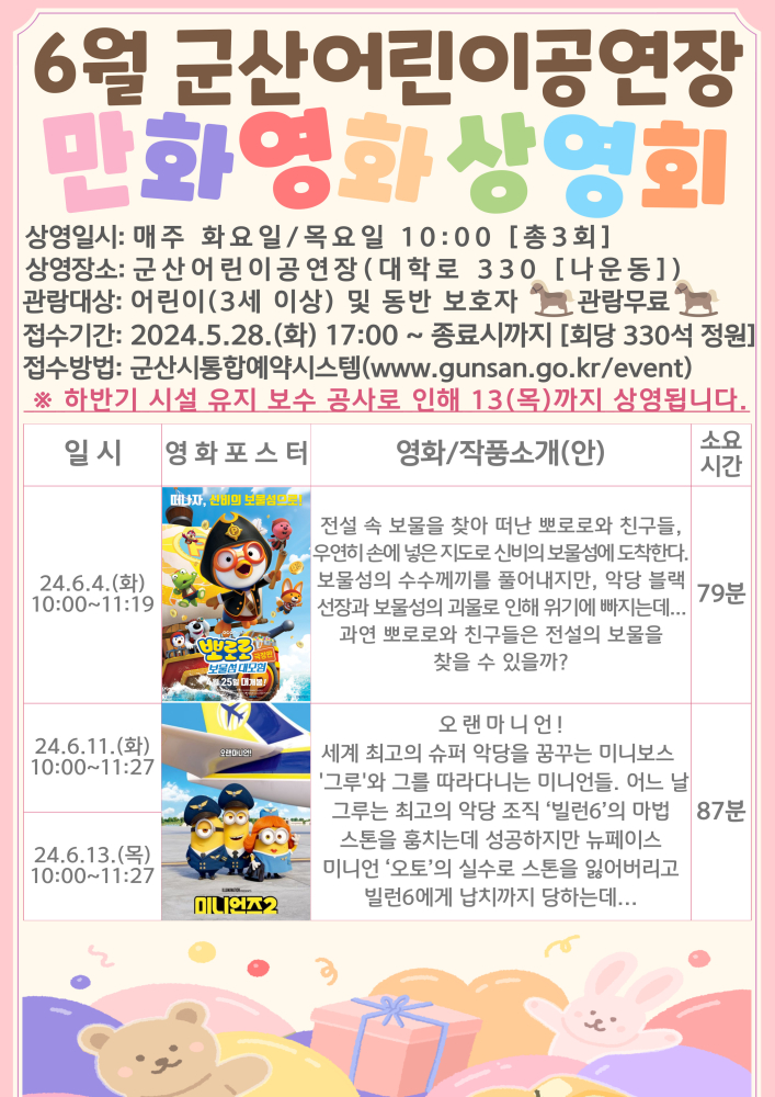 90 2024년 6월 군산어린이공연장 만화영화상영회 다운받기 예술의전당관리과 24.05.22 581