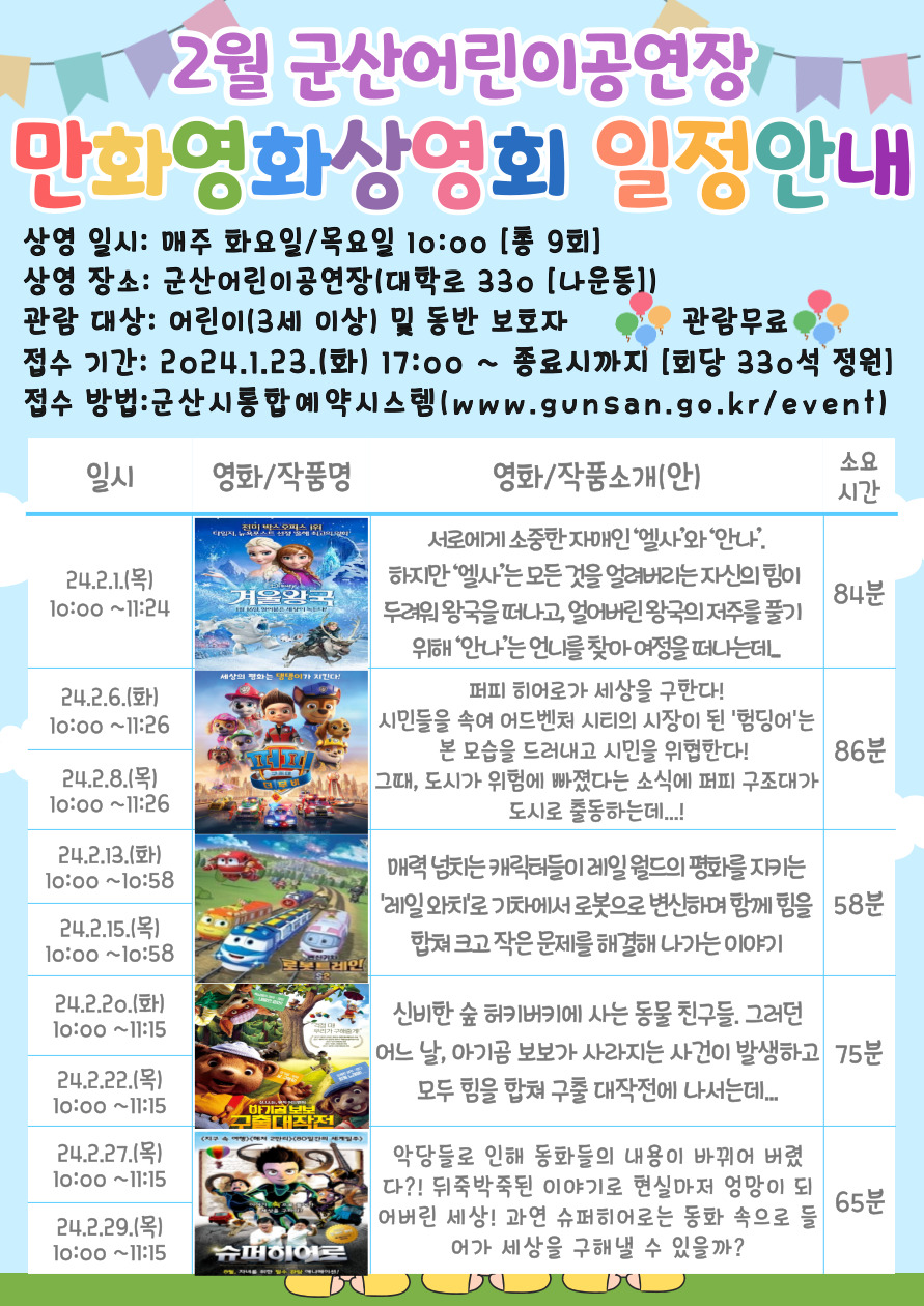 2024년 2월 군산어린이공연장 만화영화 상영회 일정 안내