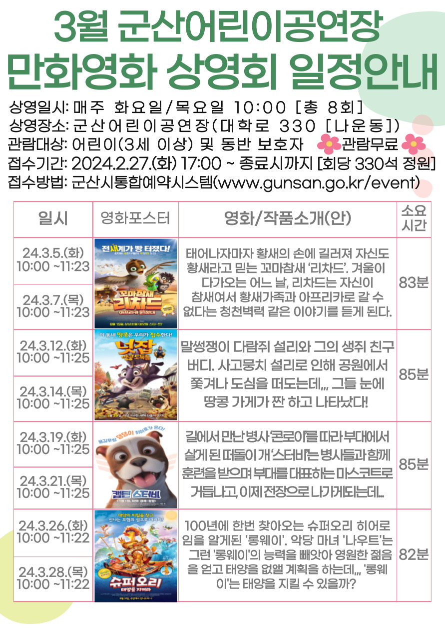 2024년 3월 군산어린이공연장 만화영화 상영회 일정 안내