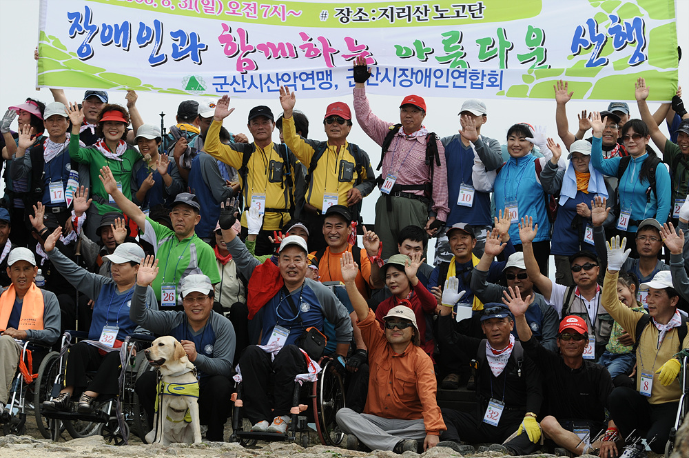 지난 8월31일(일요일) 군산시산악연맹(회장 김 성수)는 장애인50여명과 그 가족들. 그리고 250명의 군산시산악연맹산하 30여개 산악회 회원 및 자원봉사자들이 함께 어우러져 성삼재에서 노고단까지 합동산행을 실시 했습니다. 8월의 뙤약볕 아래에서 땀흘리며 휠체어를 뒤에서 밀고 앞에서 당기며 불편한 그들의 손과발,귀와 입이되어 잠시의 외출도 부자연 스러워 꺼리게 되는 장애인들에게 산악인들의 놀이마당인 산을 함께 느끼고 그들에게 사회에 당당하게 서서 할수있다는 자신감을 진작시키기 위함에 부족함이 없었다고 보여 집니다. 두시간 넘게 땀흘리며 선 노고단 정상에서 반야봉을 감싸고 돌아가는 운무만큼이나 깊은 감동을 서로가 공유했으며 그보다 더 큰 행복감은 사랑을 나누었다는데 있다고 여겨 집니다. 그렇게 네시간여의 아름다운 산행을 했으며 헤어질때는 서로가 헤어지는것이 아쉬워 마음속으로 내년을 기약하며 산행을 마무리 했습니다.