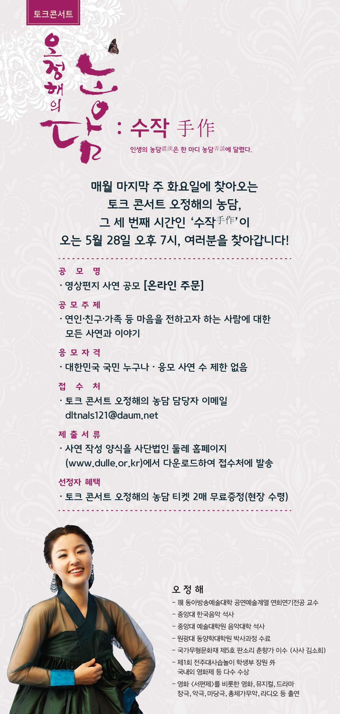 매월 마지막 주 화요일에 찾아오는 토크 콘서트 오정해의 농담, 그 세 번째 시간인 ‘수작 手作’이 오는 5월 28일 오후 7시,