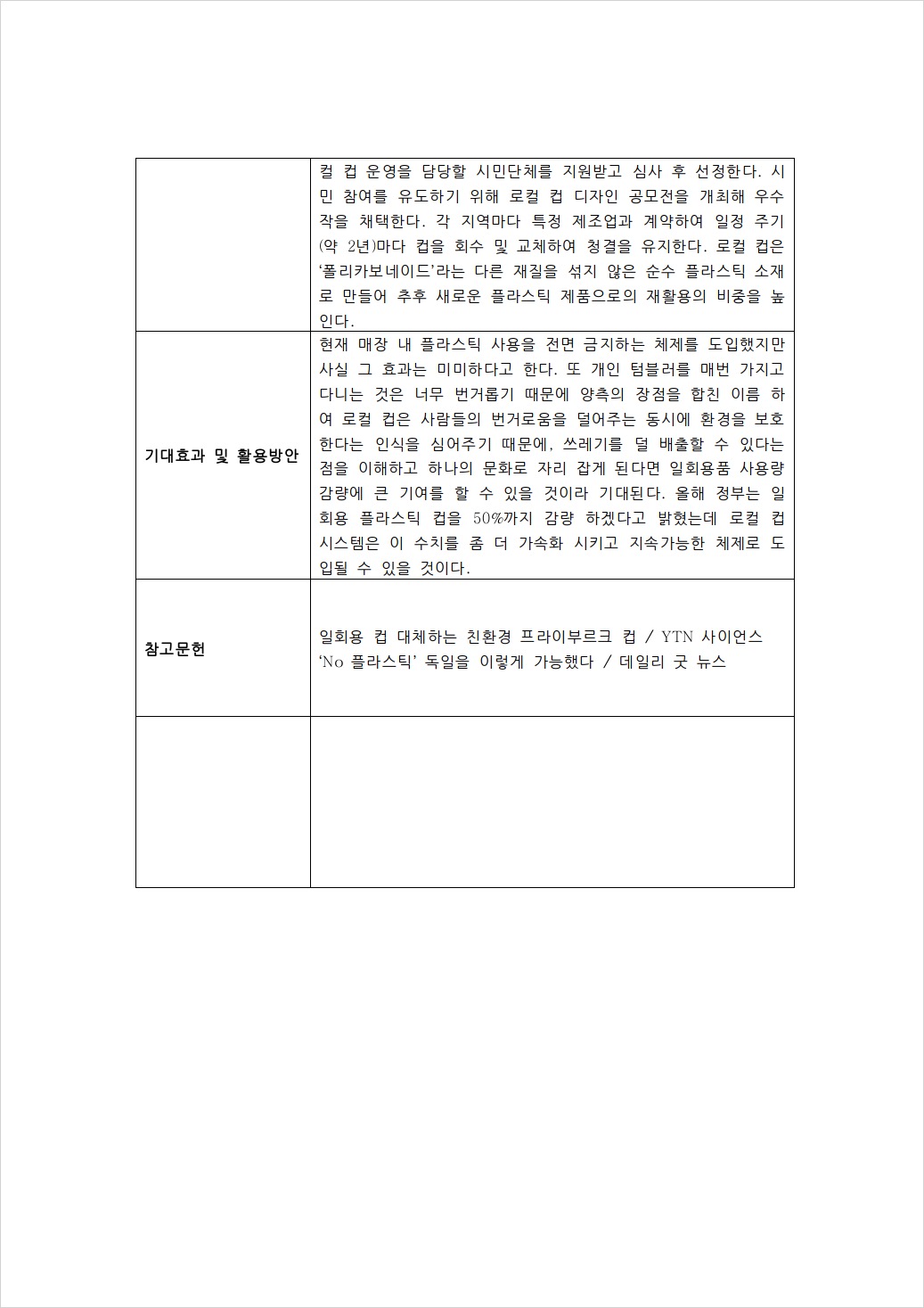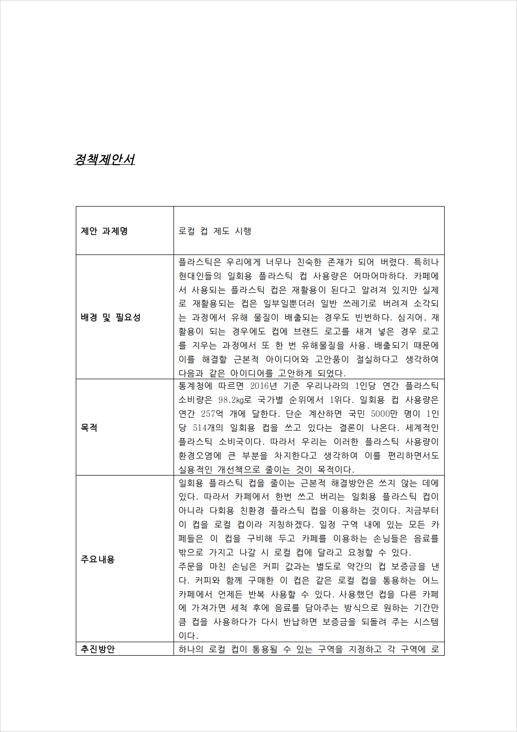 플라스틱 컵(일회용 플라스틱) 사용량을 줄일 수 있는 로컬 컵 정책을 고안하고 보내봅니다!
