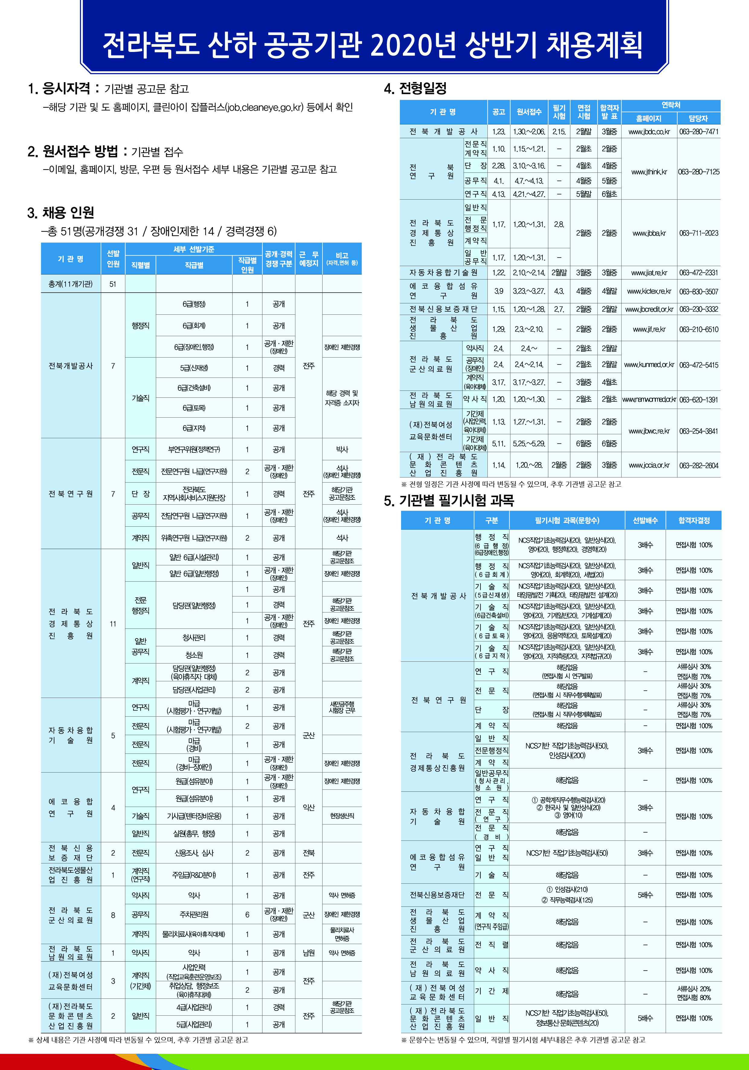 채용인원 : 총 51명 (공개경쟁 31 / 장애인제한 14 / 경력경쟁 6)