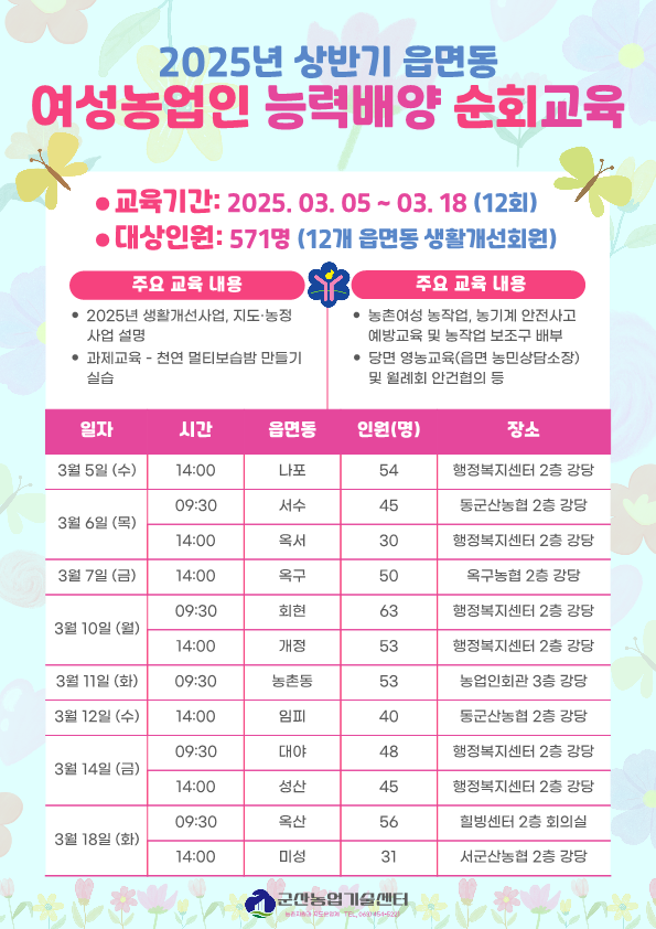 948 2025년 상반기 읍면동 여성농업인 능력배양 순회교육 일정 안내 다운받기 농촌지원과 25.02.27 814