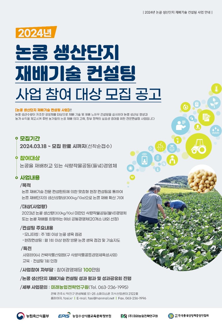 820 2024년 논콩 생산단지 재배기술 컨설팅 사업 참여 홍보 다운받기 농정과 24.04.03 758