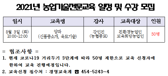 | 355 | 2021년 농업기술전문교육 양파(신품종 소개,육묘재배기술) 교육생 모집 |