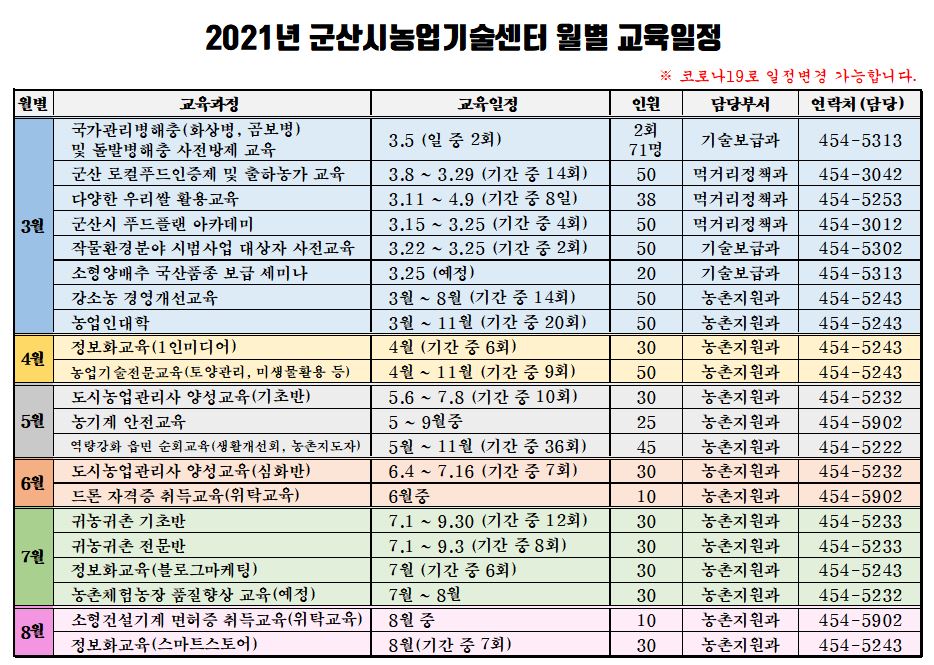 2021년 군산시농업기술센터 월별 교육일정 안내
