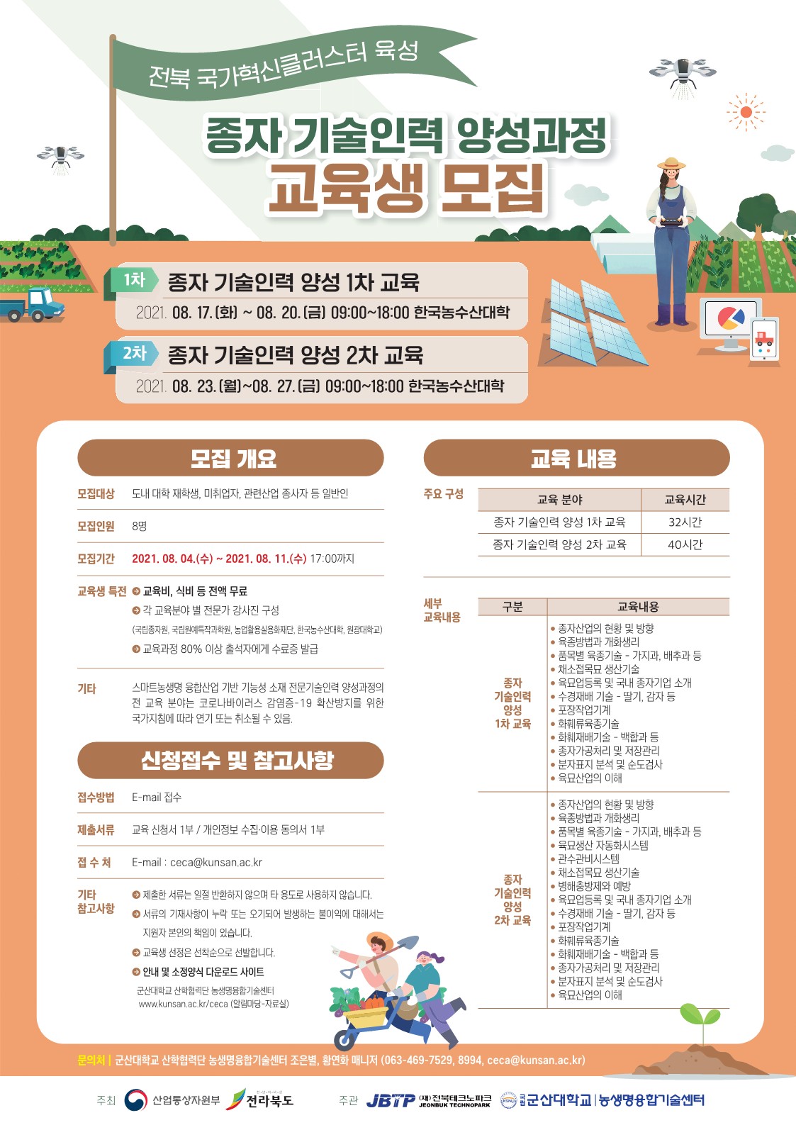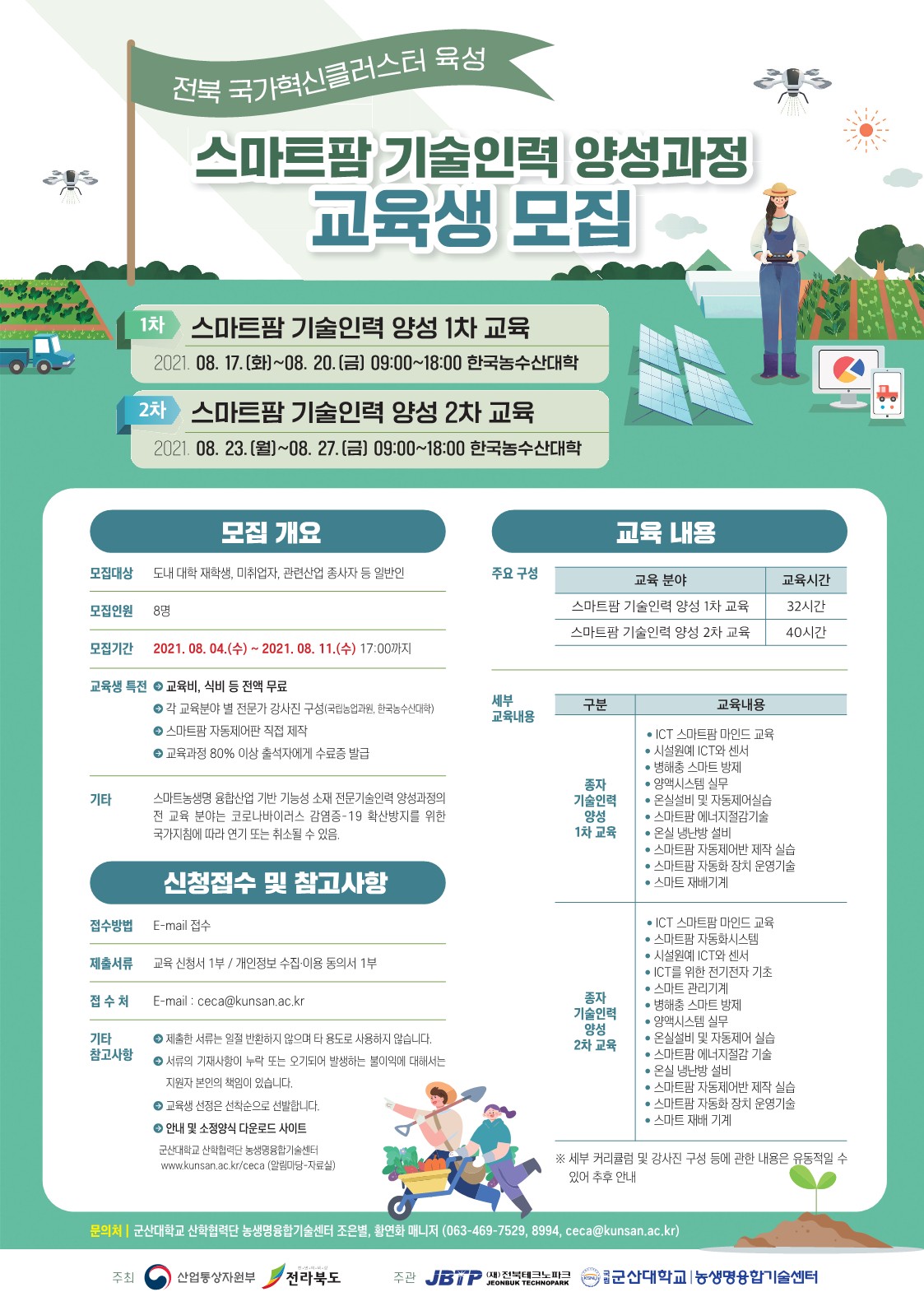 군산대학교 산학협력단 농생명융합기술센터와 전북테크노파크가 전북지역혁신클러스터 육성 사업(산업통상자원부)의 일환으로 스마트팜 및 종자 기술인력 양성교육의 교육생을 모집합니다.