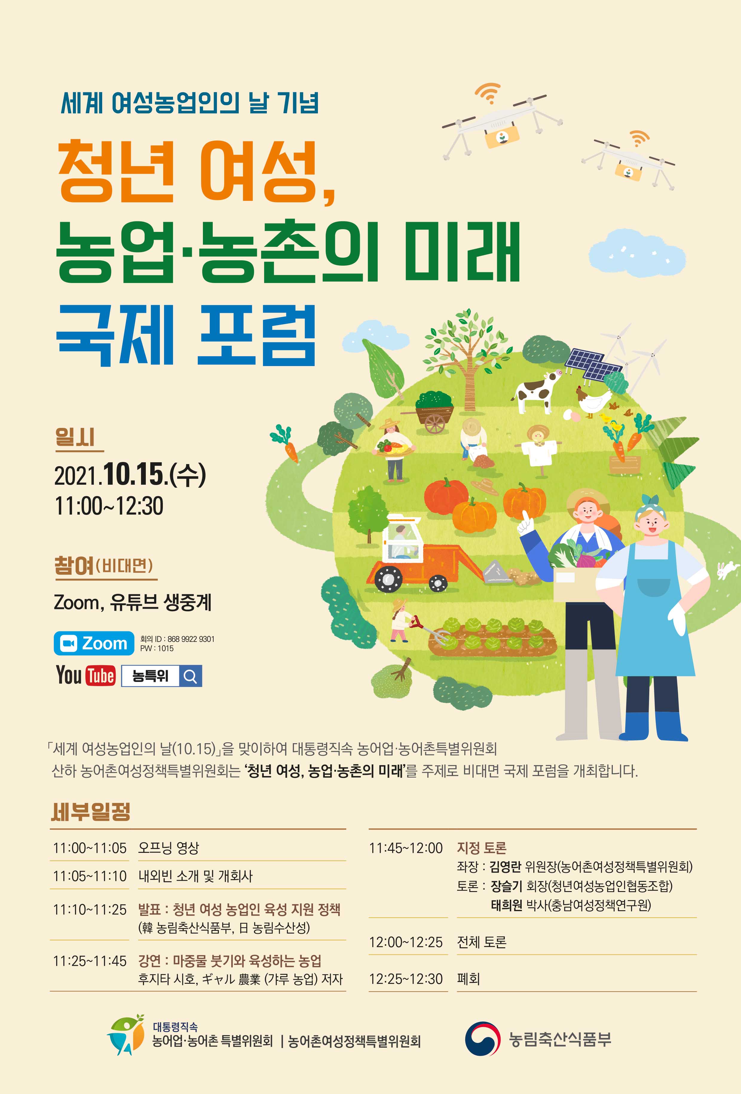 농림축산식품부에서는 세계여성농업인의 날을 맞아 여성농업인의 권익을 향상하고 자긍심을 높이기 위하여 기념행사를 온라인으로 개최할 예정이오니, 많은 시청부탁드립니다.