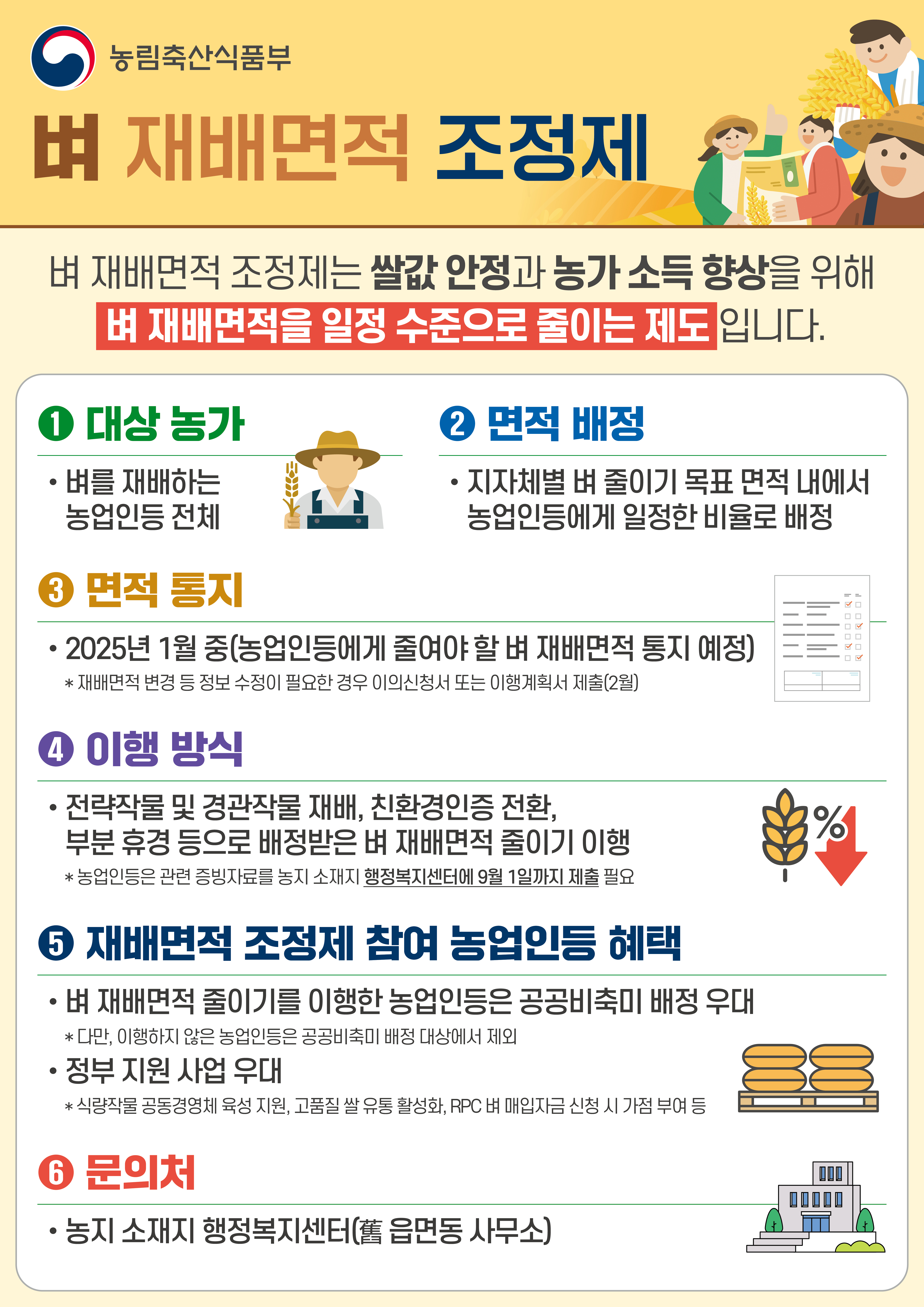농림축산식품부에서는 쌀값 안정과 농가소득 향상을 위해 벼 재배면적을 일정수준으로 줄이는 벼 재배면적 조정제를 시행함을 알려드립니다.