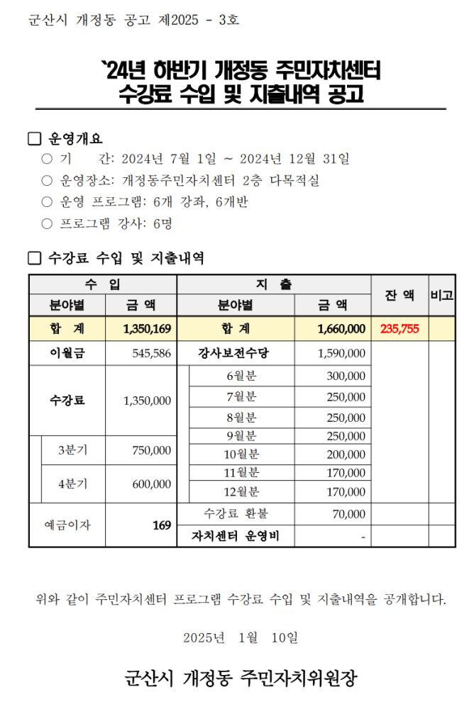 | 64 | 2024년도 하반기 주민자치센터 수강료 수입 및 지출내역 공고 |