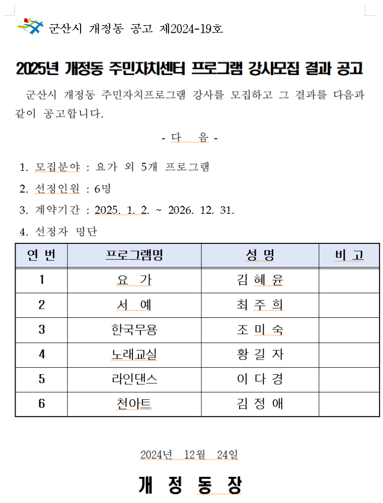| 60 | 2025년 개정동 주민자치센터 프로그램 강사 모집 결과 공고 |