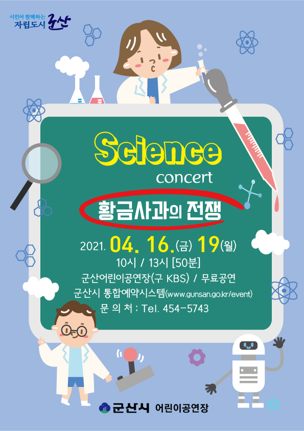 군산시에서는 과학의 달인 4월을 맞아 어린이들에게 무료공연을 제공하오니 많은 참여 부탁드립니다.