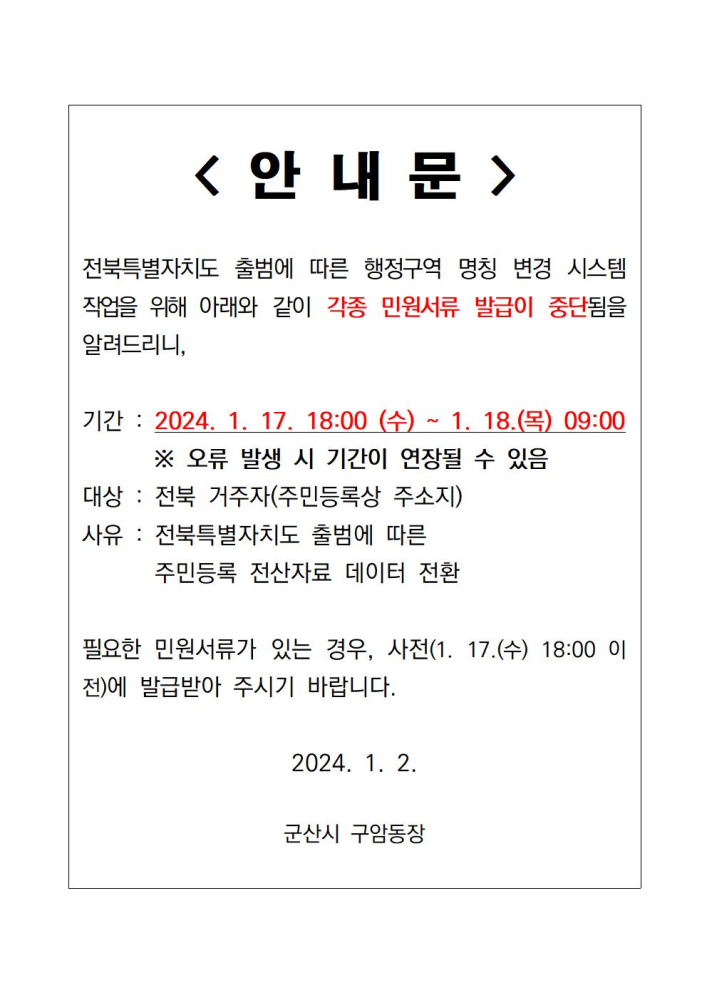 | 97 | 전북특별자치도 출범 모의훈련대비 민원서류 발급 중단 안내 |