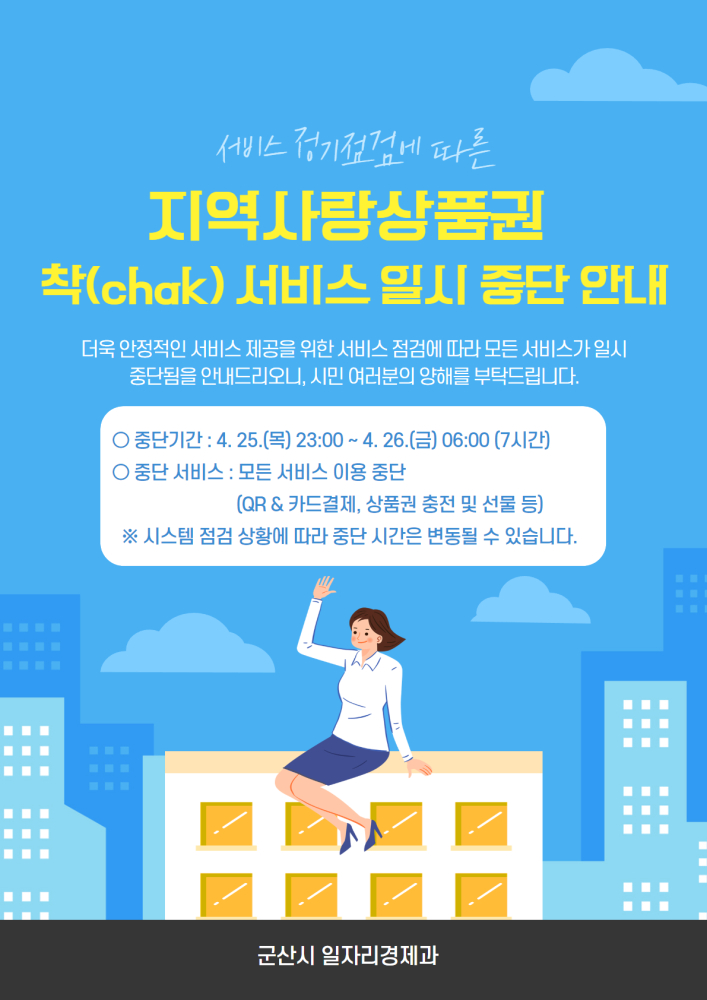 | 46 | 지역사랑상품권 착(chak)서비스(4월25일 23시~4월26일 06시)일시중단안내 |