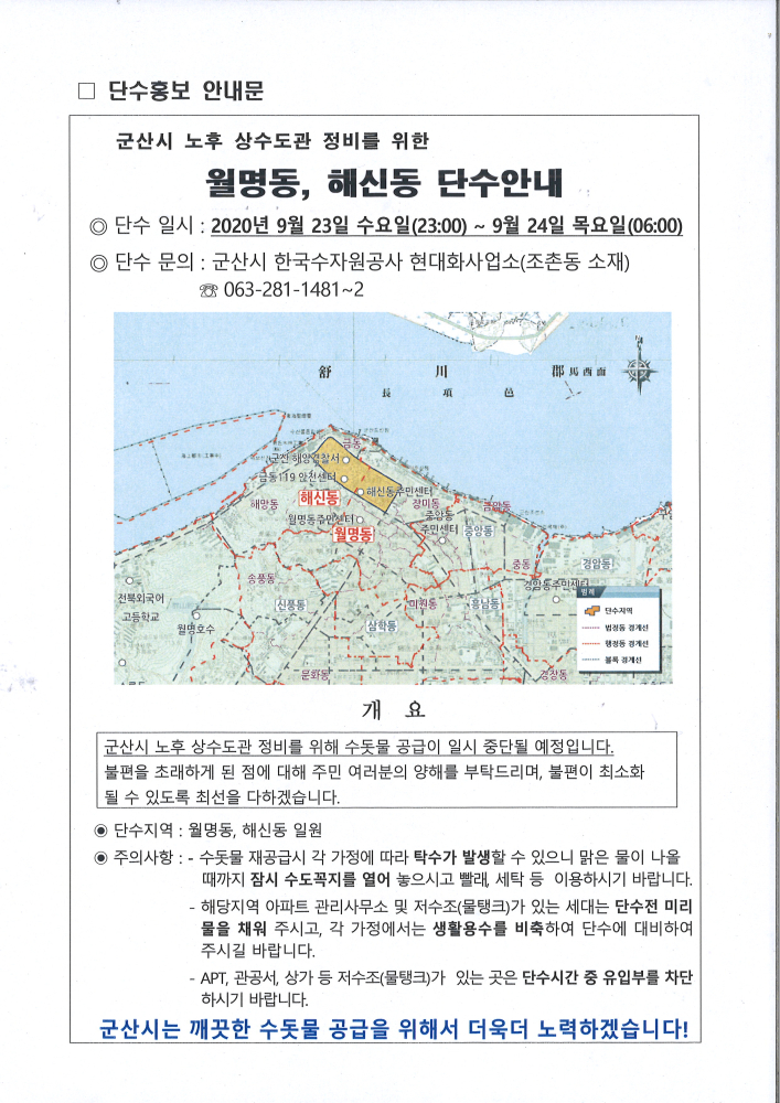 59 노후 상수도관 정비를 위한 해신동 단수안내 [9.23.(수)23시~9.24.(목)06시] 다운받기 해신동 20.09.15 1182