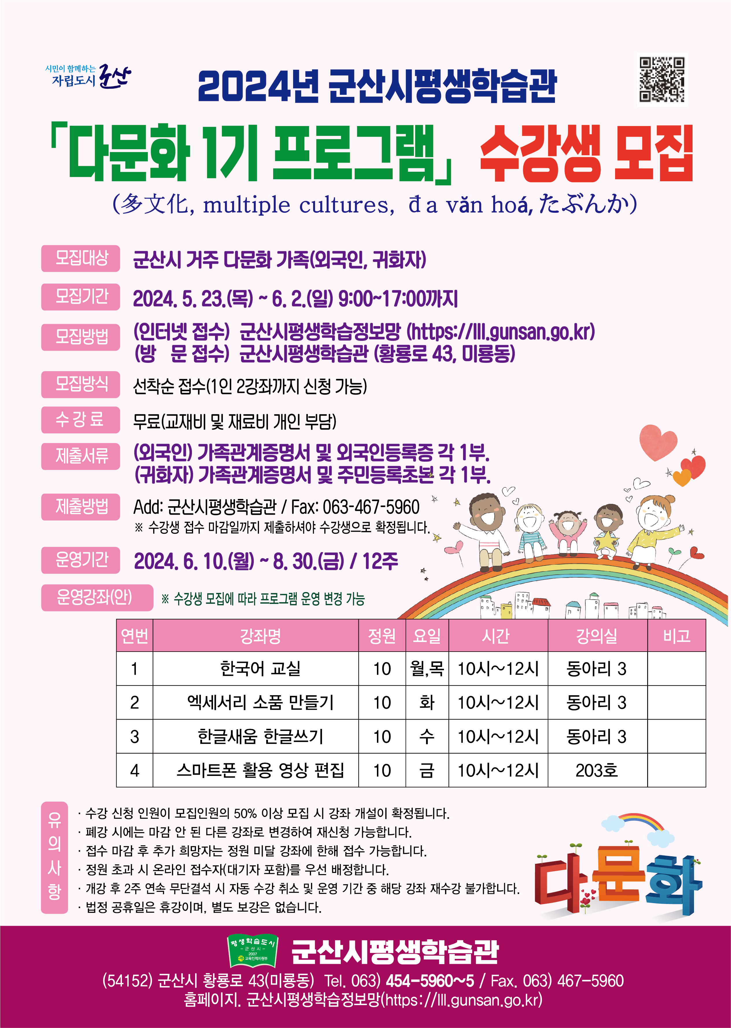 381 2024 군산시평생학습관 다문화 1기 프로그램 수강생 모집 홍보 다운받기 해신동 24.05.20 548