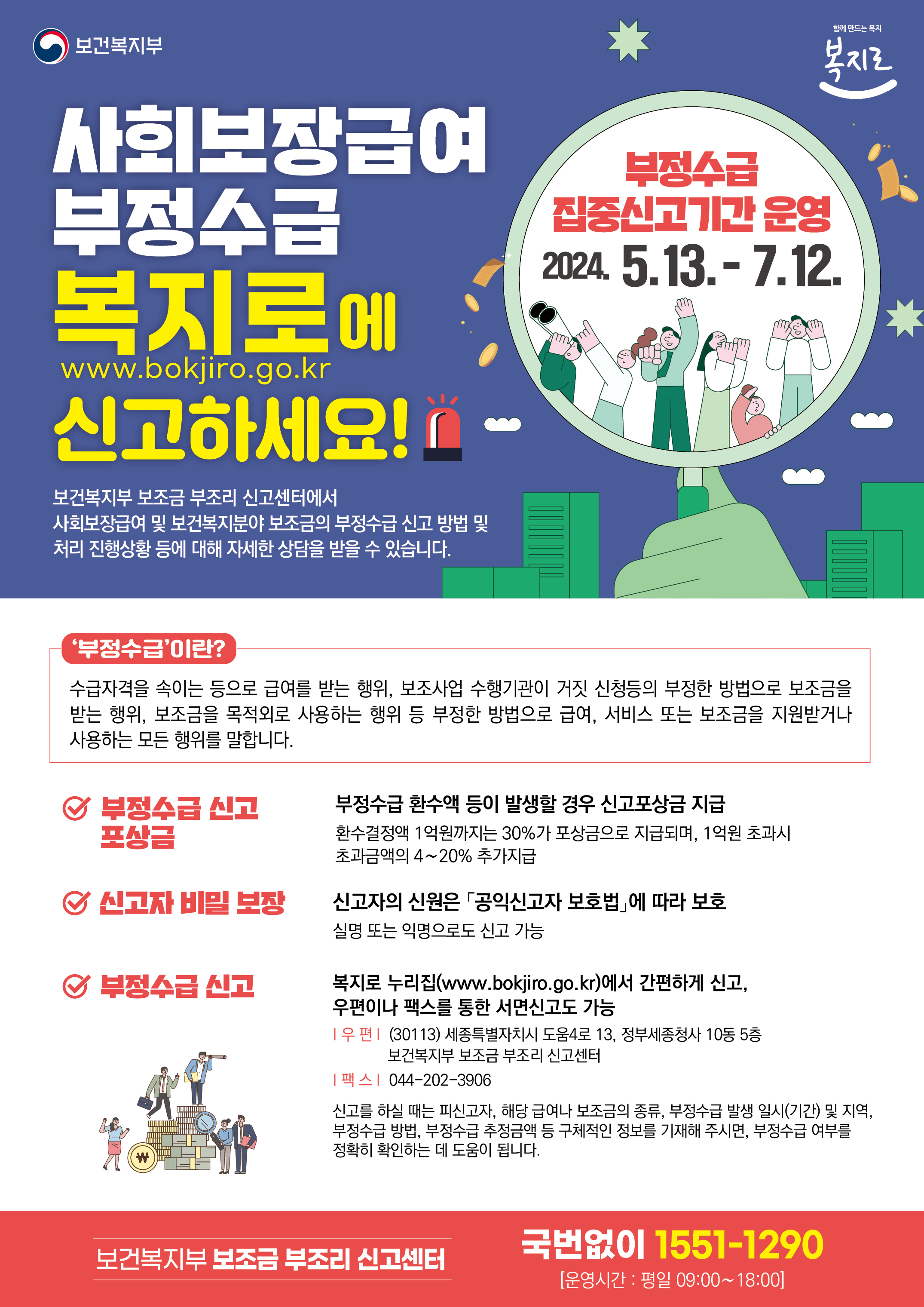 388 2024년 사회보장 ‘부정수급 집중 신고기간’ 운영 홍보 다운받기 해신동 24.05.24 491