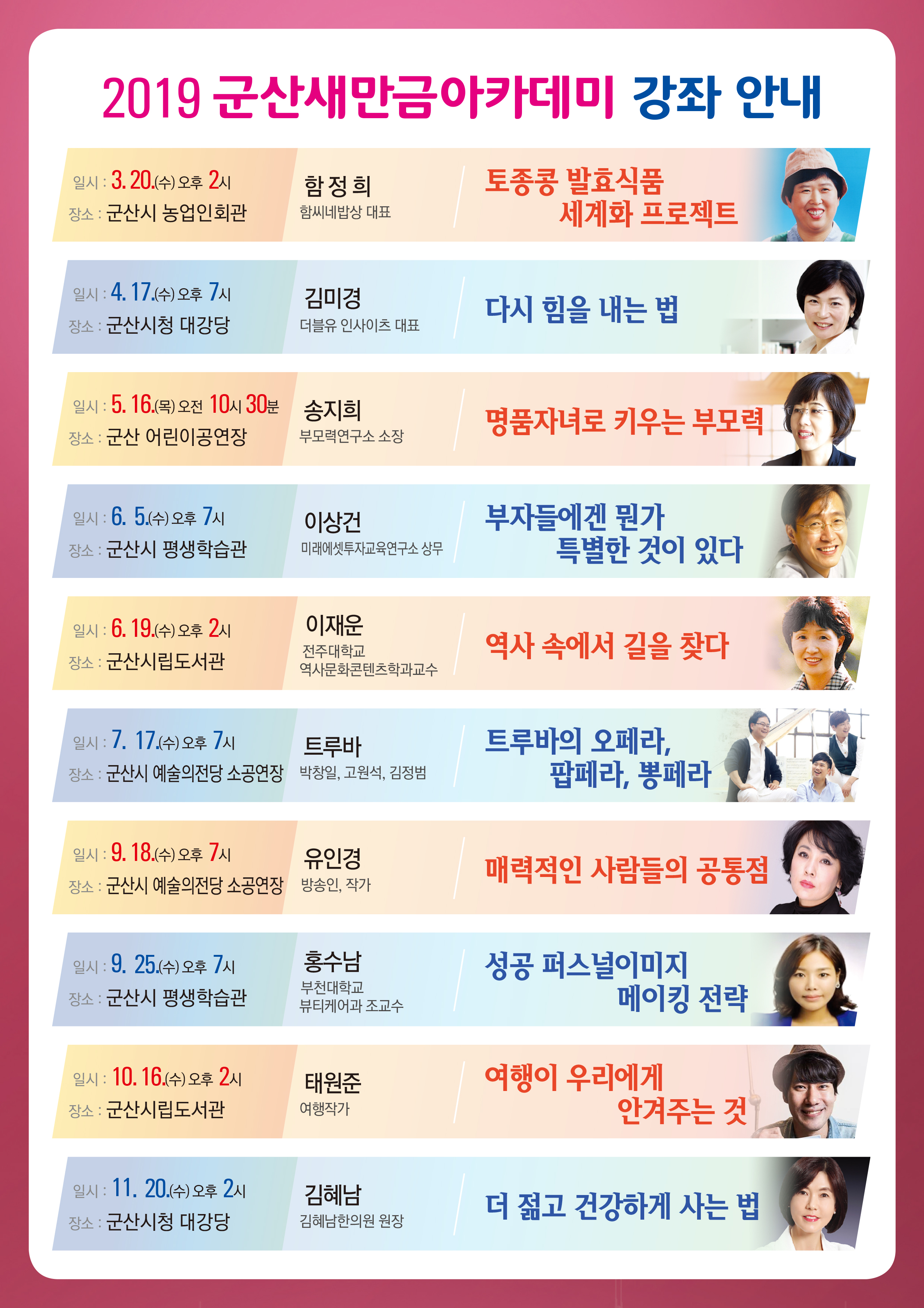 창의인재 교육도시 군산에 걸맞게 시민의 글로벌 역량을 강화하고 평생교육의 이념을 실현하고자 군산새만금아카데미에서는 명사초청 강좌를 다음과 같이 운영합니다.