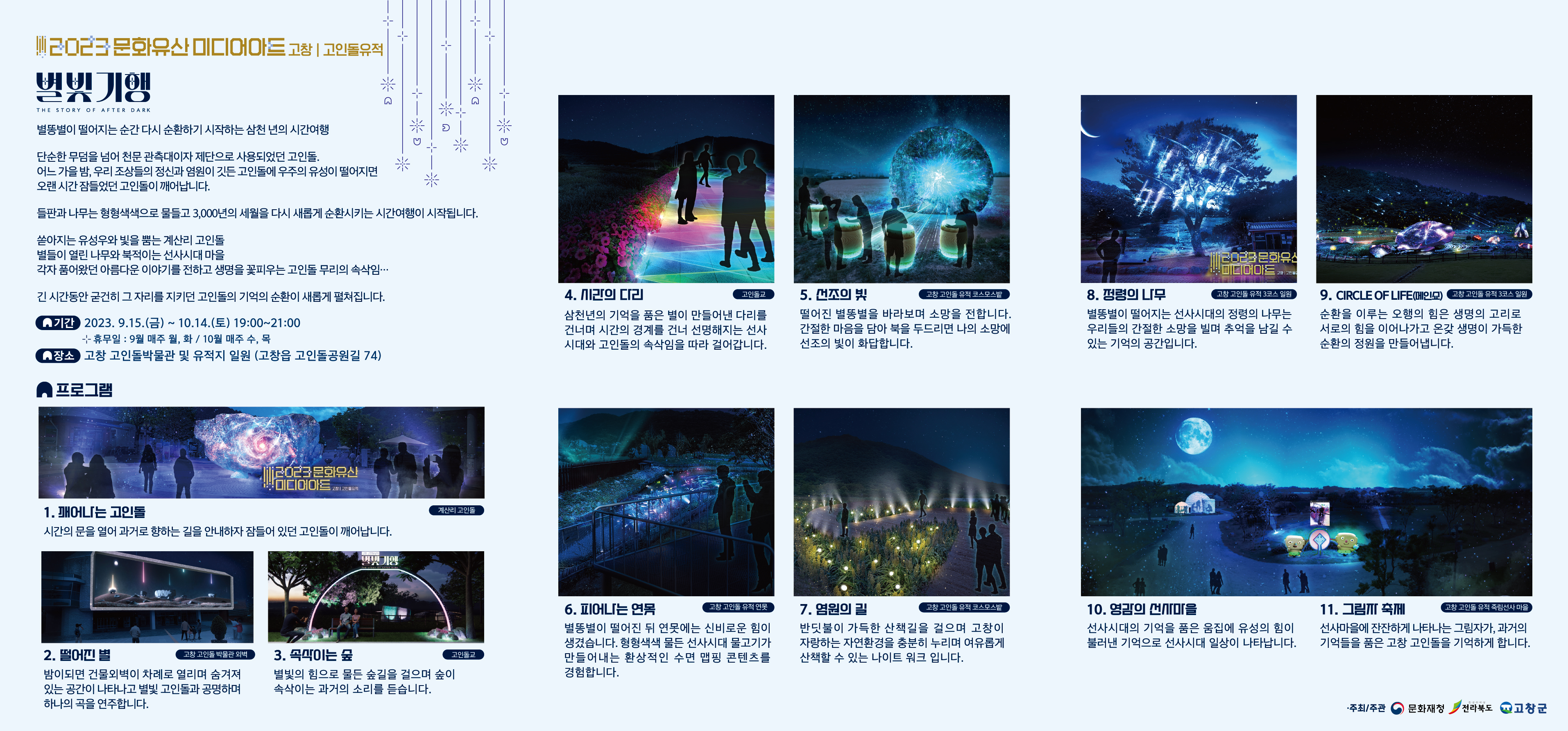 우리나라 유일의 선사시대 세계유산인 ‘고창 고인돌유적’의 탁월한 보편적 가치를 모든 분들이 친숙하게 즐길 수 있도록 고창 고인돌유적에 실감형 미디어아트 기술을 접목한 2023 고창 고인돌유적 문화유산 미디어아트가 2023년 9월 15일 개막식(19:30)을 시작으로 약 한달간 고창 고인돌유적과 고인돌박물관 일원에서 펼쳐집니다. 많은 관심과 관람 부탁드립니다.