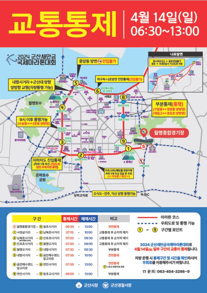 | 108 | 2024 군산새만금국제마라톤대회(4월 14일) 교통통제 구간 및 시간 안내 |