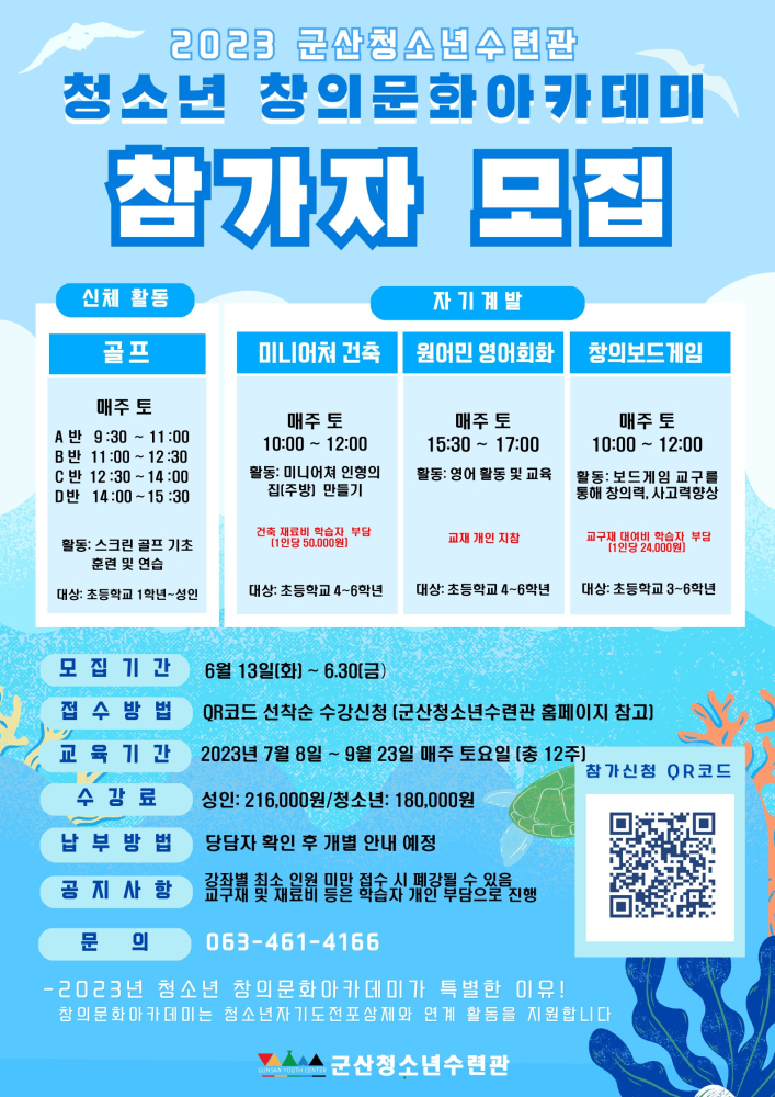 206 군산청소년수련관 「청소년 창의문화아카데미」 참가자 모집 다운받기 여성가족청소년과 23.06.16 7381