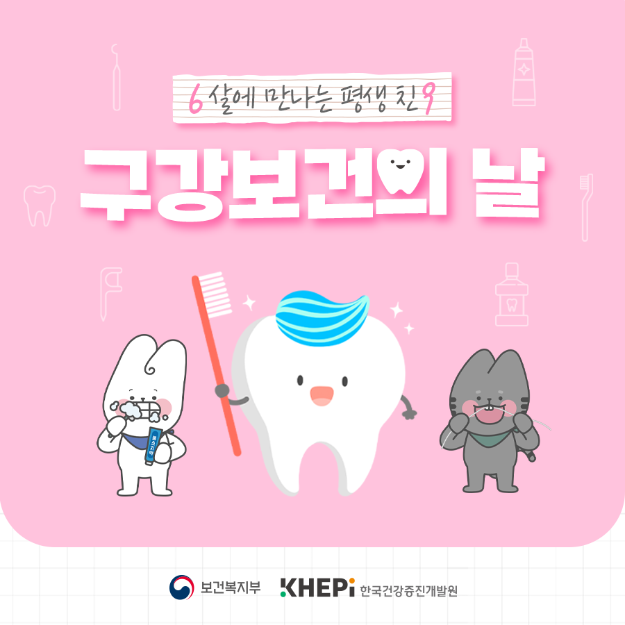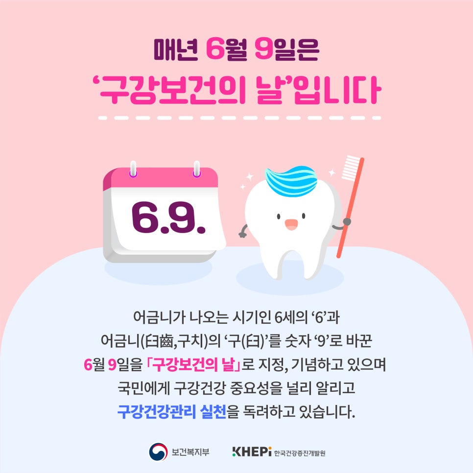 첫 영구치가 나오는 시기인 '6세', 어금니(구치:臼齒)의 '구'를 숫자화 하여 매년 6월 9일을 '구강보건의 날'로 기념하고 있습니다.