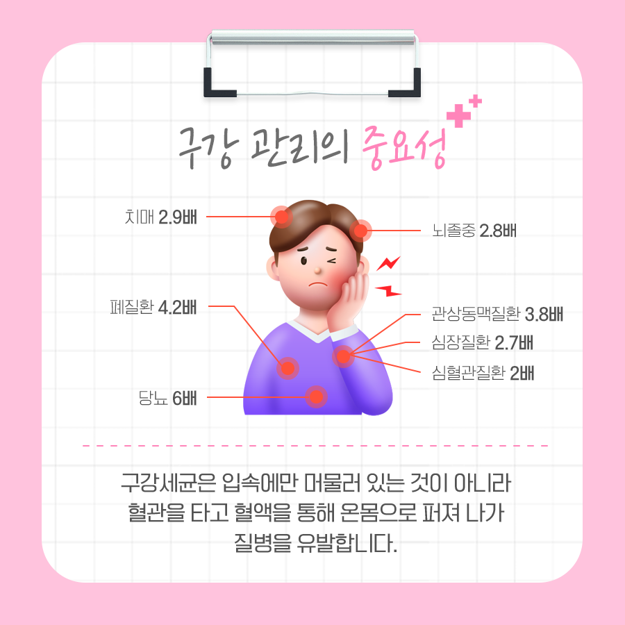 구강세균은 입속에만 머물러 있는 것이 아니라 혈관을 타고 혈액을 통해 온몸으로 퍼저나가 질병을 유발합니다.