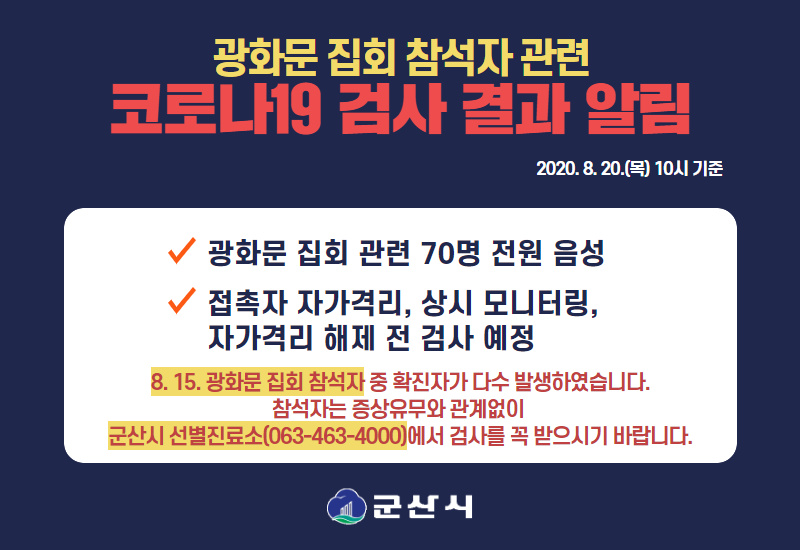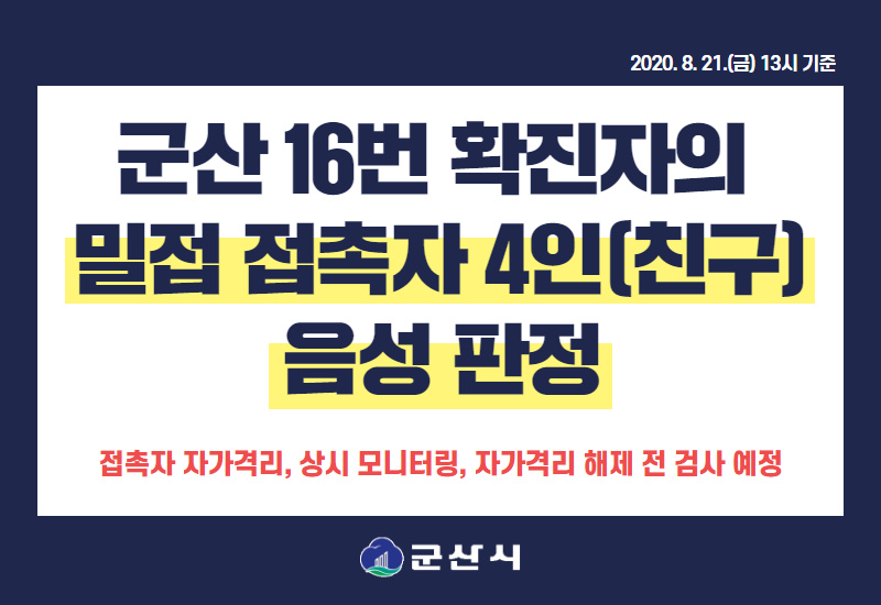 42 군산 16번 확진자의 밀접 접촉자 4인(친구) 음성 판정 다운받기 총관리자 20.08.21 5429
