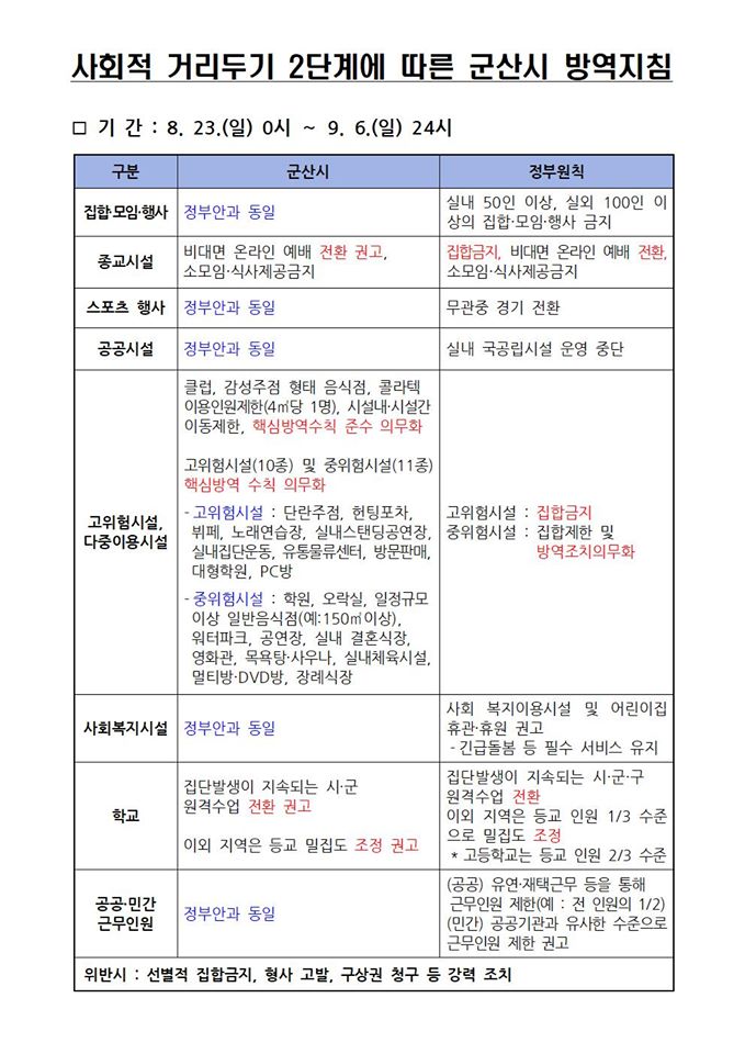 45 사회적 거리두기 2단계에 따른 군산시 방역지침(8월 23일 0시 ~ 9월 6일 24시) 다운받기 총관리자 20.08.23 6650