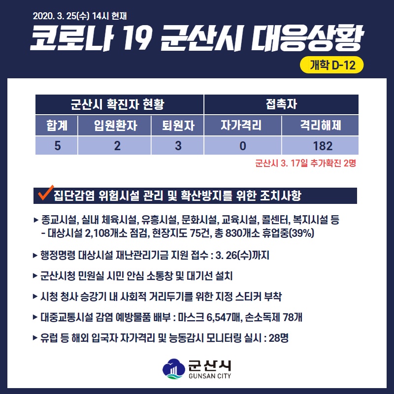 9 코로나19 군산시 대응상황[3.25.(수) 14시 기준] 다운받기 총관리자 20.03.25 1894
