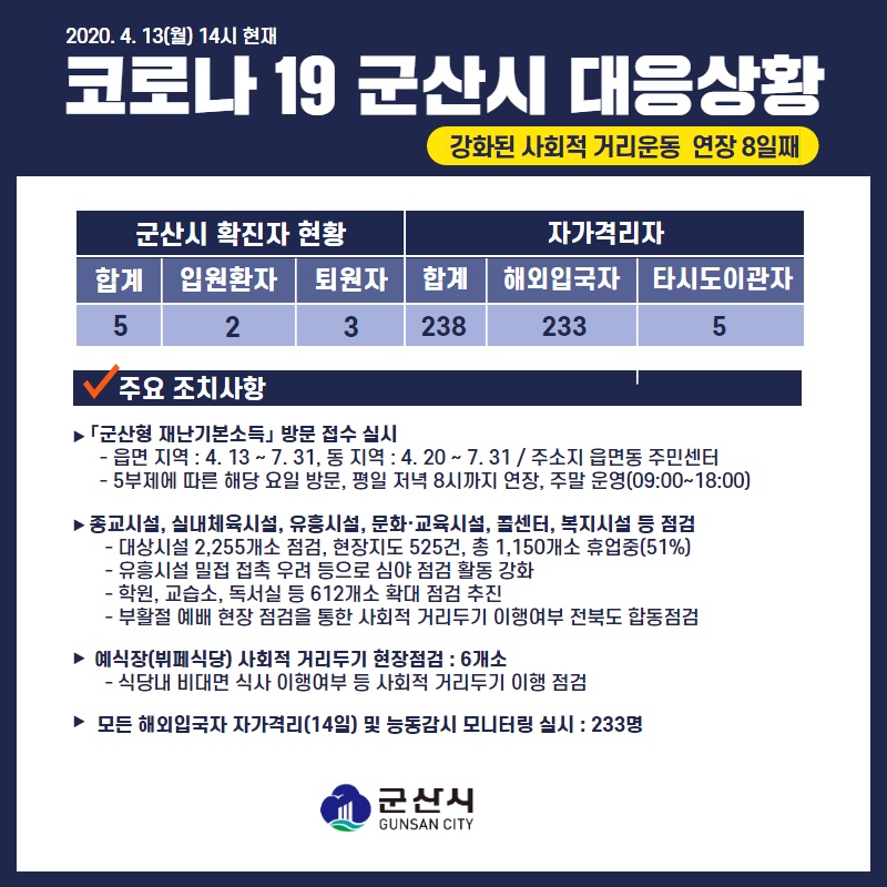 14 코로나19 군산시 대응상황[4.13.(월) 14시 기준] 다운받기 총관리자 20.04.14 2254