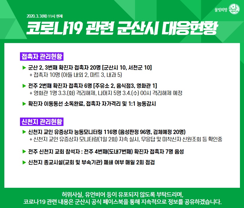 1 코로나19 관련 군산시 대응 현황(3월 3일 11시 기준) 다운받기 총관리자 20.03.03 2457