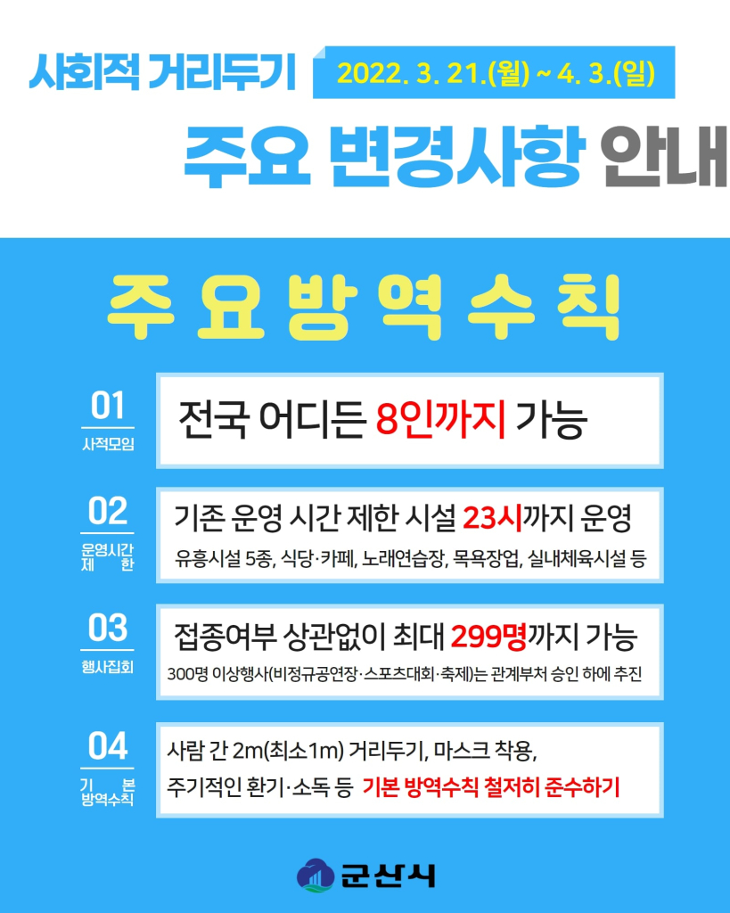 671 2022. 3. 21.~2022. 4. 3. 사회적 거리두기 강화방안 연장 안내 다운받기 총관리자 22.03.21 746