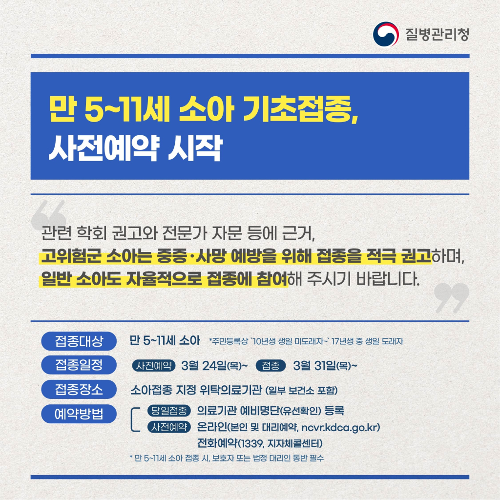 677 만 5∼11세 소아 기초접종 사전예약 시작 다운받기 총관리자 22.03.25 520