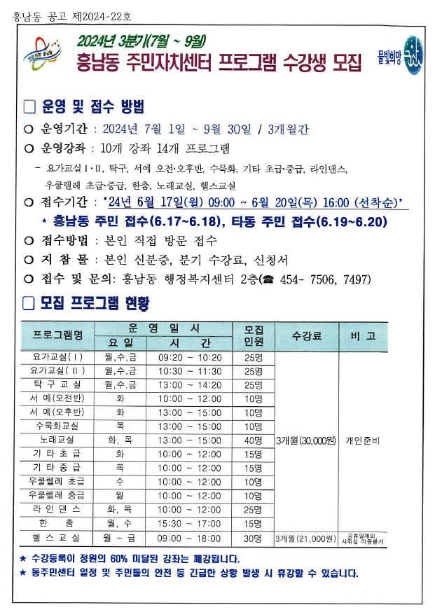 | 350 | 24년 3분기 흥남동 주민자치센터 프로그램 수강생 모집 공고 |
