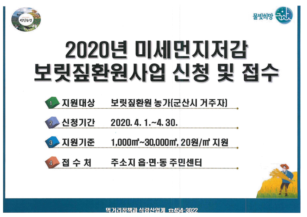 | 15 | 2020년 미세먼지저감 보릿짚환원사업 신청 및 접수 안내 |