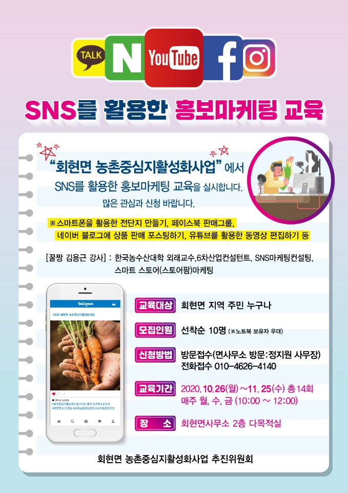 | 23 | 농촌중심지활성화사업 SNS 활용한 홍보마케팅 교육(10.26.~11.25.) |
