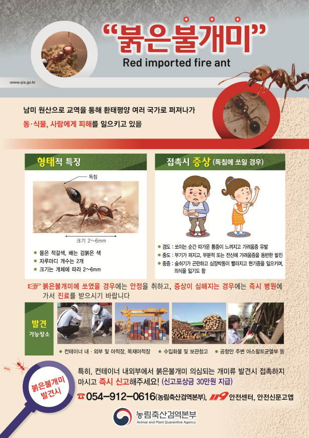(※ 붉은불개미 발견시 농림축산검역본부(054-912-0616), 안전신문고 앱, 119 등에 신고)
