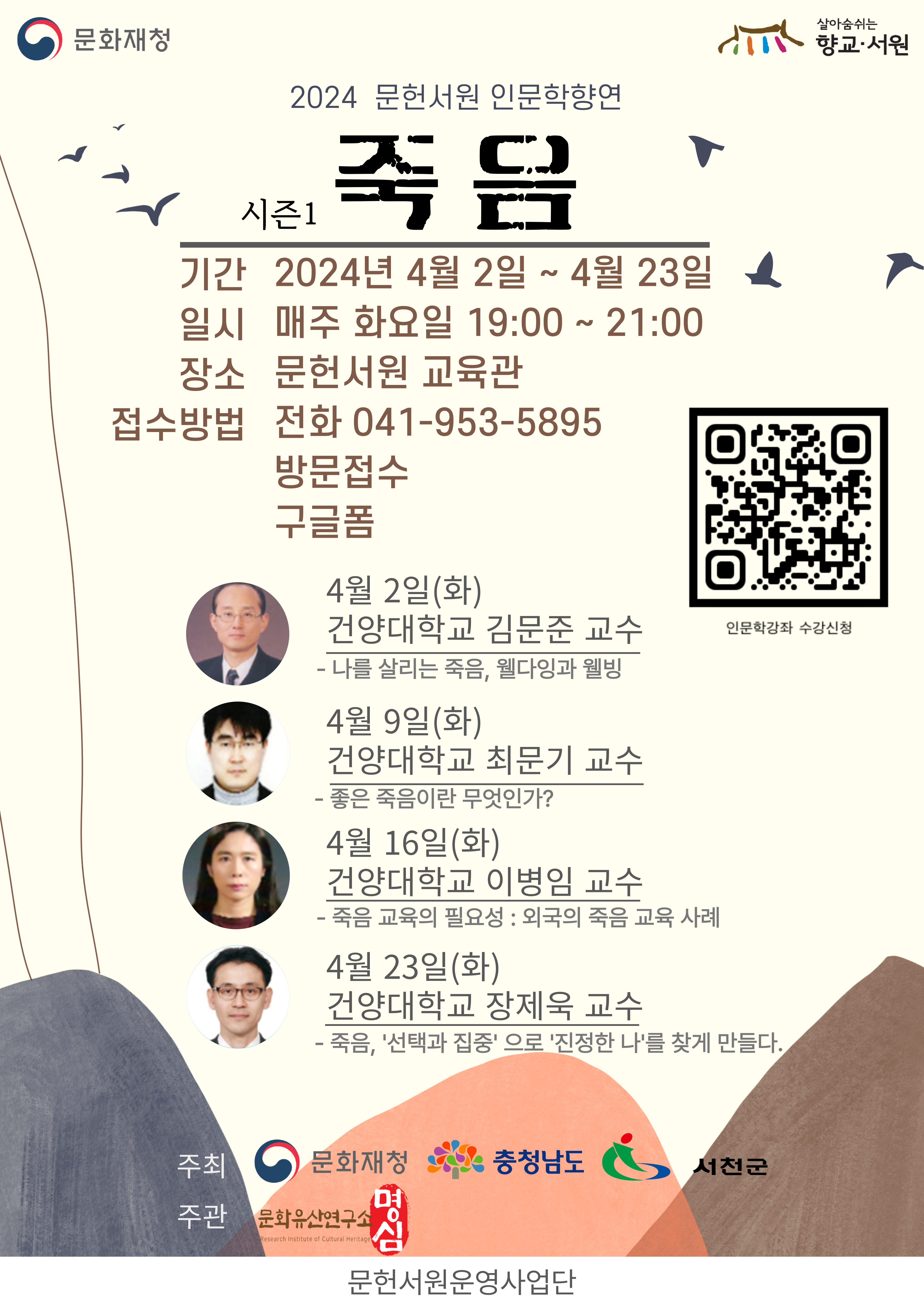 안녕하세요. 2024년 4월 2일부터 서천 문헌서원에서 인문학향연 강좌가 시작됩니다. 아래와 같이 수강자를 모집하오니 참여를 희망하는 여러분의 많은 관심과 참여 부탁드립니다. ○ 강의기간 : 2024년 4월 2일(화) ~ 4월 23일(화) ○ 일 시 : 매주 화요일 19:00 ~ 21:00 ○ 강의장소 : 문헌서원 교육관 ○ 접수방법 : 전화 041-953-5895 현장접수 구글폼