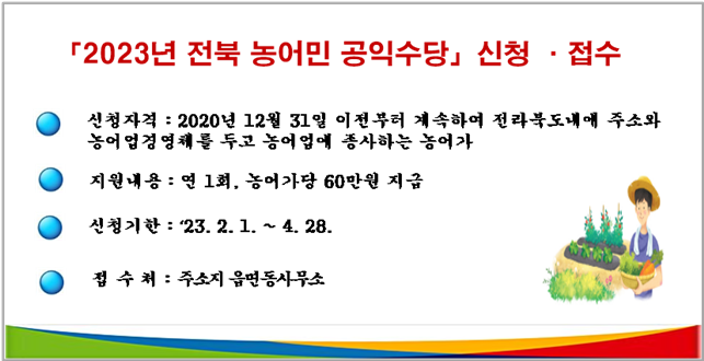| 12 | 2023년도 전북 농어민 공익수당 신청 접수 안내(4월 28일까지) |