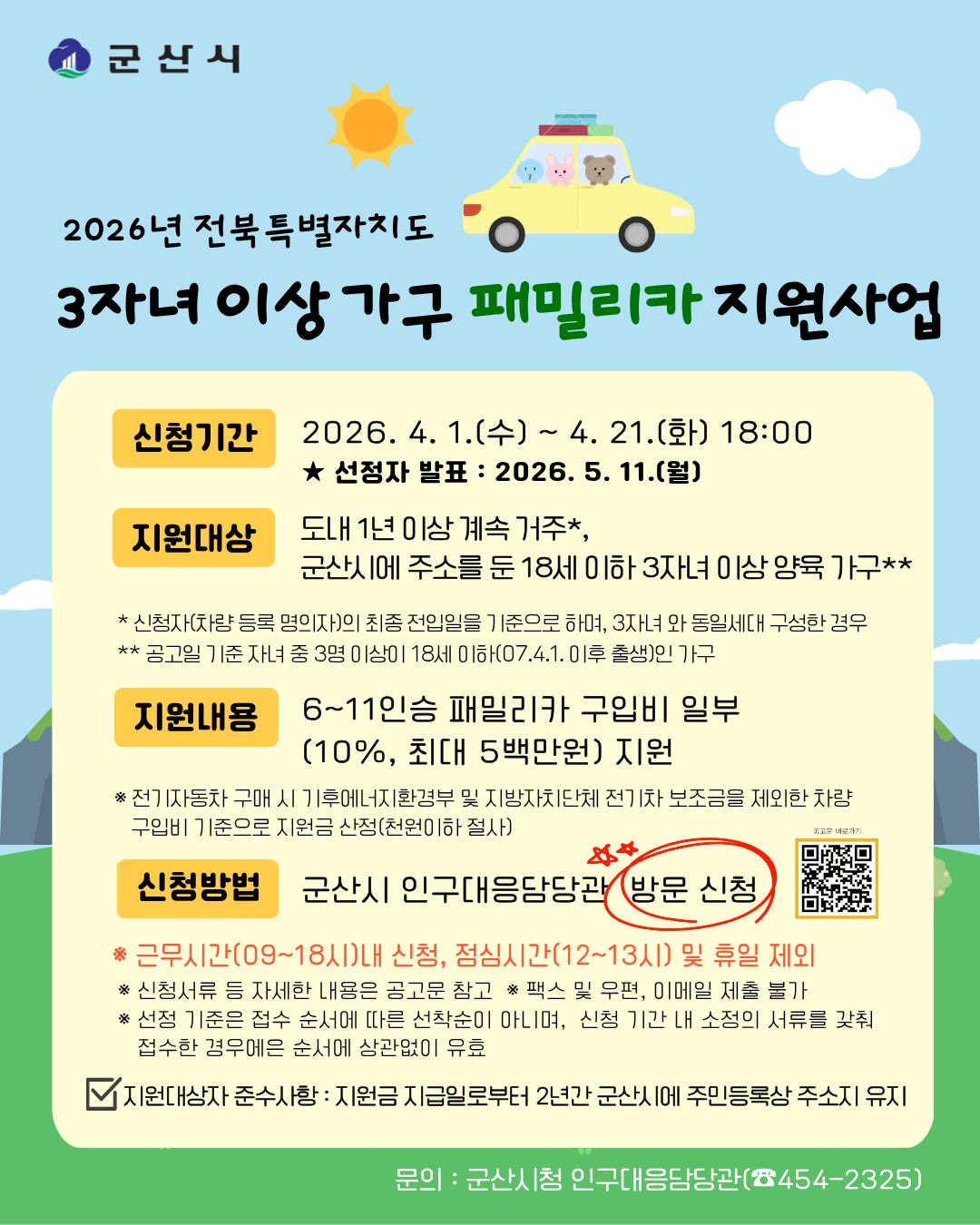 1. 공 고 명 : 2026년 3자녀 이상 가구 패밀리카 지원사업