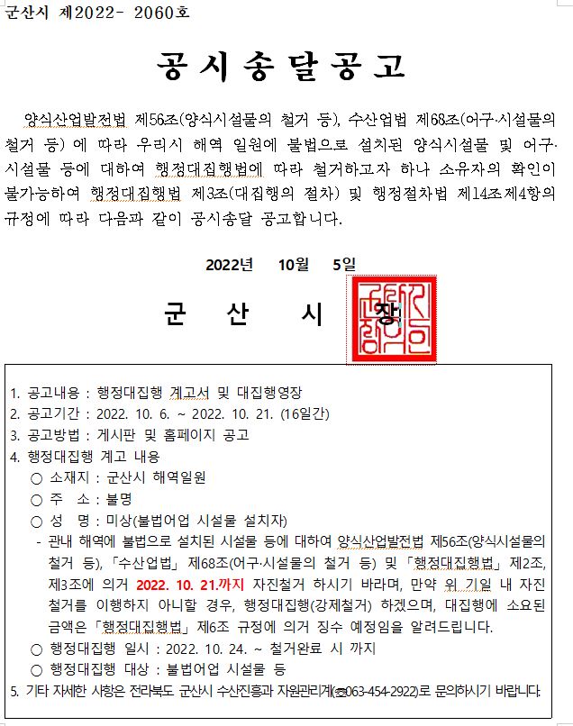 | 239 | 불법어업 어구·양식시설물 등 행정대집행을 위한 계고서 및 대집행영장 공시송달 공고 |