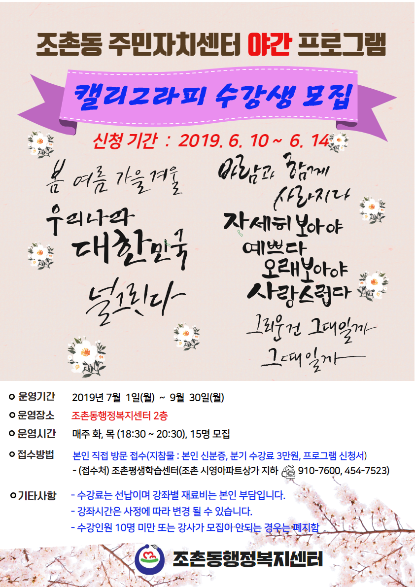 2019년 3분기 조촌동 주민자치프로그램 야간강사 및 수강생을 아래와 같이 모집하고자 합니다.